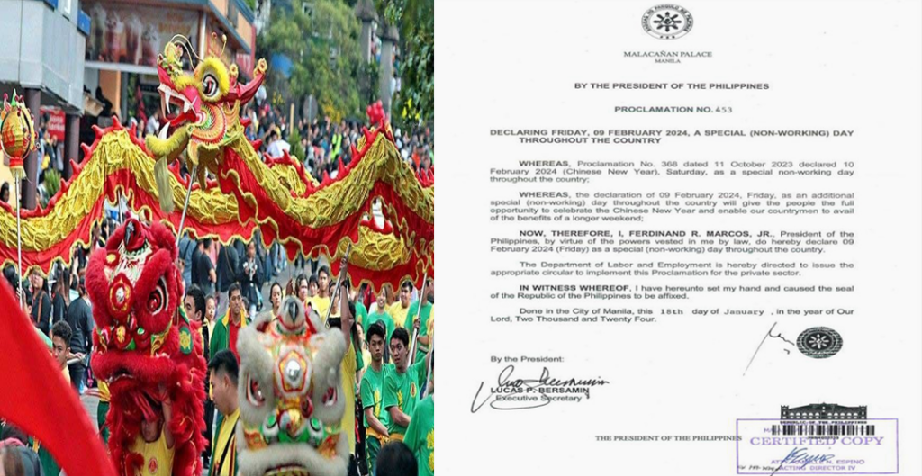 A special non-working day has been declared throughout the country on February 9, 2024, by Malacañang to commemorate the start of the traditional lunar Chinese New Year.
