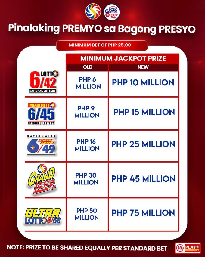 The minimum jackpot reward under the revised prize structure was P10 million for Lotto 6/42, P15 million for Mega Lotto 6/45, P25 million for Super Lotto 6/55, P45 million for Grand Lotto 6/55, and P75 million for Ultra Lotto 6/58.