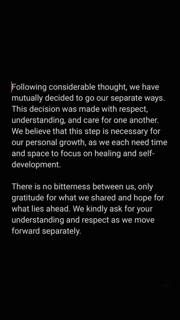 After giving it some serious consideration, we have agreed to part ways. The two said, “This decision was made with mutual respect, understanding, and care.”
