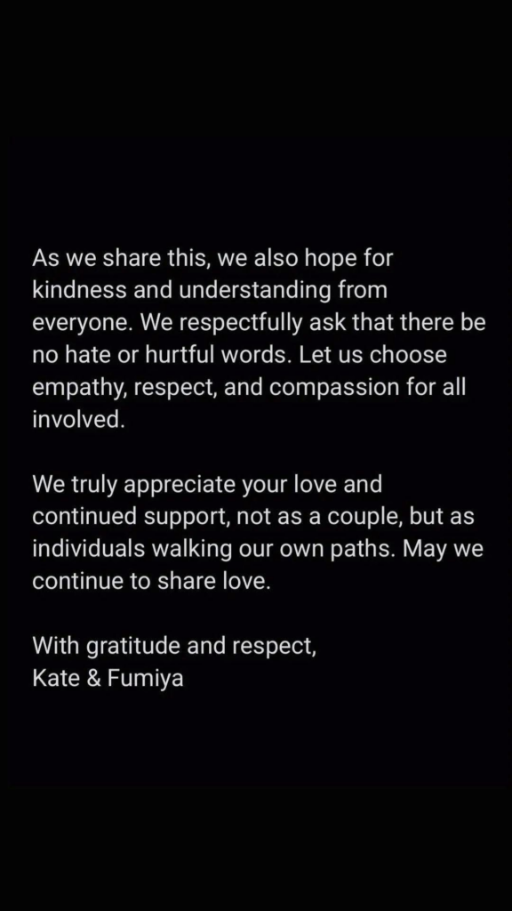 Both Fumiya and Kate assured supporters that they remain focused on their personal growth and careers. Fumiya is currently working on new creative projects, while Kate continues to take on acting opportunities.