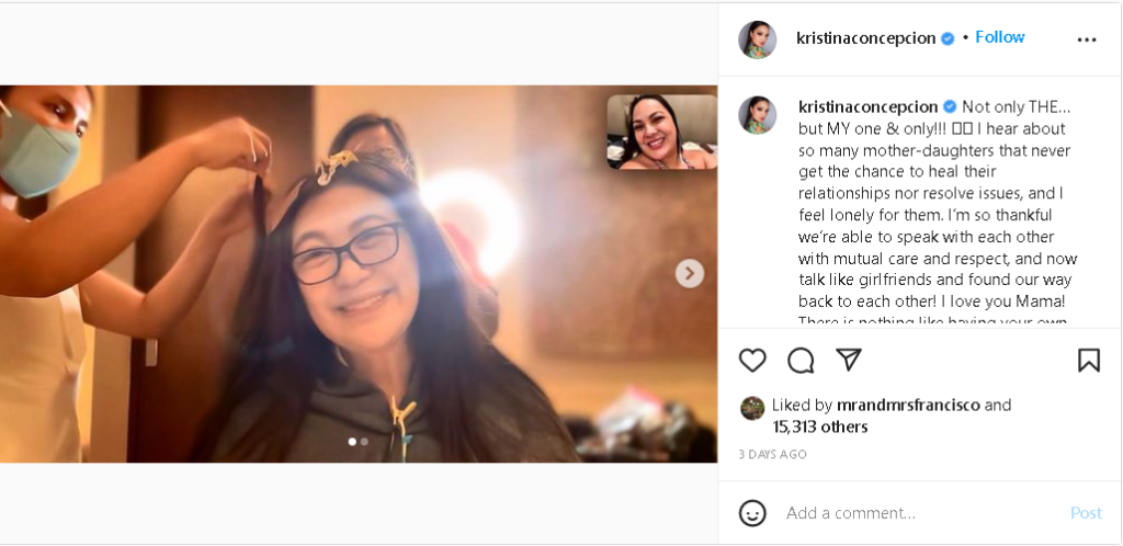 “I’m so thankful we’re able to speak with each other with mutual care and respect, and now talk like girlfriends and found our way back to each other! I love you Mama! There is nothing like having your own mother’s LOVE. @reallysharoncuneta.”